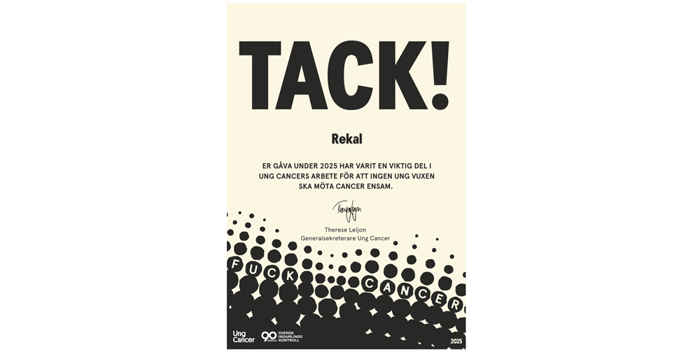 Vi har valt att ge en gåva till Ung Cancer för att stödja deras viktiga arbete för unga vuxna som lever med eller nära cancer.