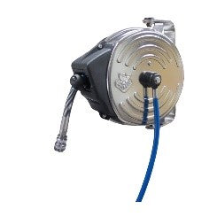 Slangupprullare täckt i rostfritt stål. Anslutningsslang 1,5m. Polyuretan slang 10 meter, med svivelfäste.